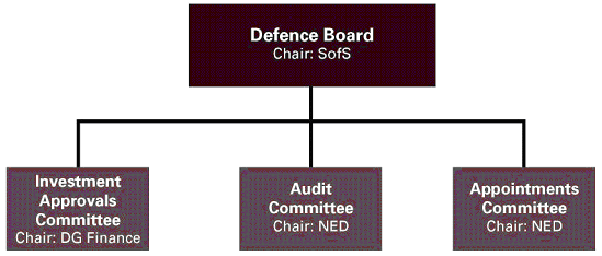 4.8 We have drawn on these criteria to develop a proposed subordinate committee structure. An Investment Approvals Committee would meet the first criterion, and could act on the Board's behalf to reduce the volume of work it would otherwise have to cover itself. An Audit Committee, chaired by one of the Defence Board's NEDs, is mandated by the Cabinet Office's Corporate Governance Code. The Code also mandates a committee to cover issues such as succession planning and senior appointments. In the Defence context, we also see merit in creating a new Appointments Committee to the Board, again chaired by one of the Defence Board's NEDs, so that 'people' issues at the senior levels of Defence benefit from a collective civilian and military view. This committee would provide oversight of career management systems for senior military officers and senior civil servants. This structure is set out below.