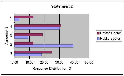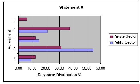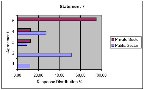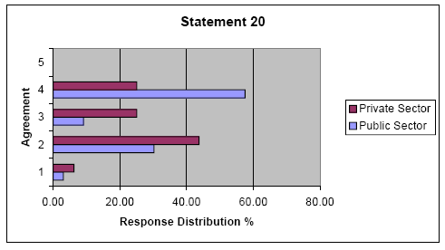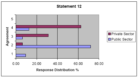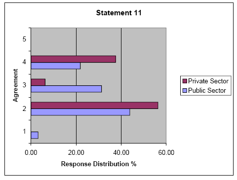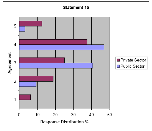 Inspection of the response distribution graphs (Figures 9. and 10.) reveals that profiles for Statement 15 were quite similar, while the graphs for Statement 11 reflect a degree of uncertainty in the public sector not reflected in the private sector; however the group responses were statistically similar.