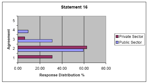 A visual inspection of the response graphs in Figures 7. and 8. supports the rejection of the null hypothesis for both statements. In responding to Statement 12 the public sector group provides modest support for its employees as compared to the strong support shown by its private sector peers, but this support disappears when the issue is readdressed in Statement 16. In this case the public sector tends to disagree that private sector employees are less motivated, albeit with less intensity than the private sector survey group.