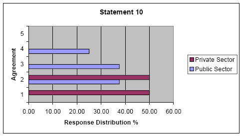 A review of the response distribution confirms that the private sector strongly supported Statement 7 (Figure 5.), while the public sector at least moderately disagreed with that statement. The surprising twist was found within the results for Statement 10. Again the null hypothesis was rejected by a t-test probability of .00000. In this case however, the public sector had a mean of 2.88 and a mode of 3.00, while the private sector had a mean of 1.50 and a mode of 1.00. A review of all responses to Statement 10 (Figure 6.) confirms the unexpected finding that the public sector and the private sector distributions are dissimilar; however the variance is in the degree of negativity rather than polar opposition. Both groups have some responses that indicate disagreement, and the disagreement is more strongly expressed within the private sector, yet 28% of the public sector respondents also disagreed with the statement.