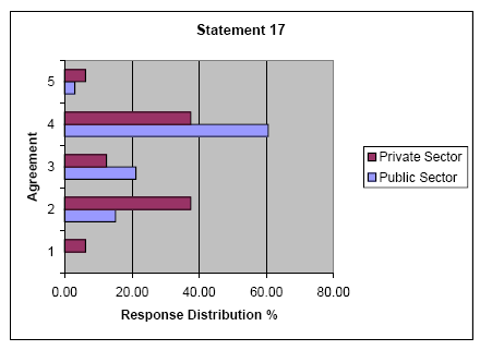 Statement 18: "Private sector managers are generally well compensated for goal achievement while public sector managers receive no additional compensation for similar results." The difference in compensation and incentives for private sector managers compared to their peer managers in the public sector is well documented. This statement was included to test the responses of both groups, and a generally positive response was expected from both sectors. Results were as anticipated as significant agreement with this statement was present across the groups. The t-test analysis produced a probability of .50000 and the null hypothesis could not be rejected. The public sector had a mean distribution of 3.91, and the private sector had a mean of 3.88, with both sectors having identical modes of 4.00.