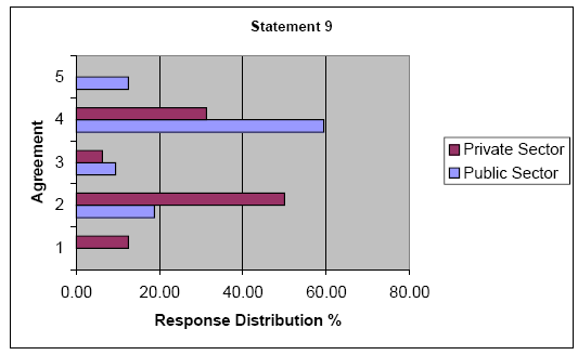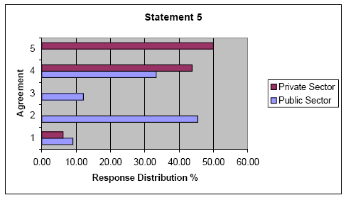 Statement 5: "Public sector management must work within a framework of bureaucratic regulation that tends to minimize innovative goal setting." This statement introduced the concept of the inefficient bureaucrat. Again the two groups diverged in their opinions and the null hypothesis was rejected with a t-test probability of .0000067. The public sector generally disagreed with a mean response of 2.70 and a mode of 2.00. The private sector strongly supported the idea with a mean response of 4.31 and a mode of 5.00.
