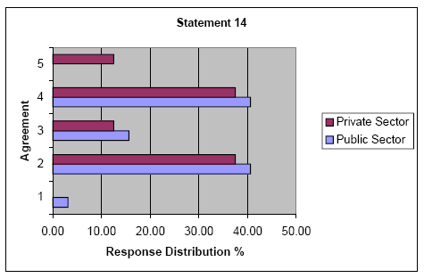 Statement 14: "Public bidding and disclosure regulations generally prevent public sector managers from maximizing the cost-benefit potential of purchased goods and services." The impact of bidding and disclosure requirements on the efficiency of the public sector business model was addressed in Statement 14. Both groups were internally split with near equal numbers agreeing or disagreeing with the statement. The null hypothesis was sustained by a t-test probability of .204335. The public sector had a mean distribution 2.97 and a mode of 2.00, while the private sector had a mean distribution of 3.25 and a mode of 2.00. The identical negative mode of 2.00 might lead one to believe that the groups tended to disagree with the statement, but a close inspection of the response distribution graph (Figure 13.) shows that "indecision" would be a better term as both groups are almost equally distributed around neutrality.