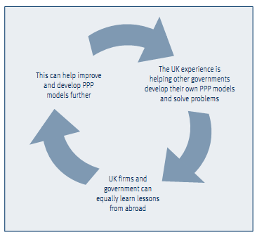 The diagram below (Exhibit 3) illustrates the 'virtuous circle of international PPP development'. The UK experience is helping other governments to develop their own PPP models and markets. In the same way, the UK is learning from other countries that are designing new models to move forward in PPPs - as seen in Japan. Building on the lessons learnt is a driver of success and can help improve PPP models further.