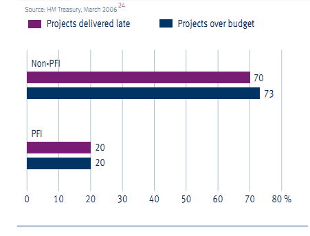 Traditional procurement meant that if the project went wrong, taxpayers would unknowingly pick up the bill. The use of private capital has increased the transparency of public finances, as the flow of money between partners has to be recorded and accounted for.18