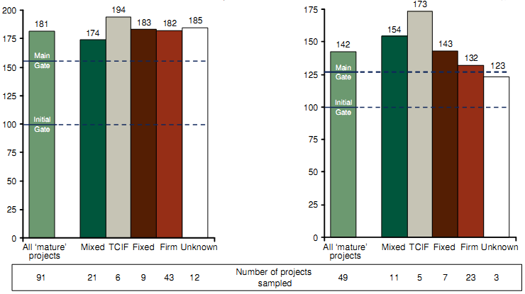 Index of project duration (Forecast at Main Gate50 = 154) | Index of adjusted unit cost (Forecast at Main Gate50 = 127) |