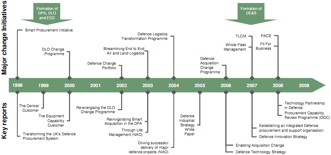 Since 1998, with the introduction of Smart Acquisition, there have been several significant programmes involving major reorganisation, process improvement, skills upgrading and efficiency drives. Whilst much of the Smart Acquisition structure was put in place immediately following its inception, the acquisition system has been under more-or-less continuous change since then. A timeline which summarises those changes is shown in Figure 4-1.