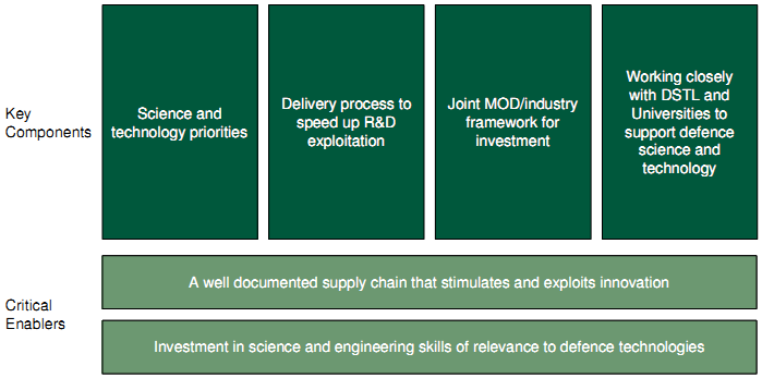 In response to needs identified in the DIS, the Defence Technology Strategy (DTS) was published in December 2006 and set out Departmental priorities for R&D, funding, skills, improved processes, opportunities and areas for international research collaboration20. The key components of the DTS, along with critical enablers are shown in Figure 5-3 below.