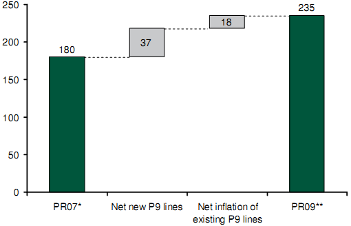 Across the two year period from PR07 to PR09, the average annual rate of addition to the EPP (to its stage 3b iteration) from new P9 lines44 is £19bn, and a further £9bn p.a. is added from net increases to the cost of projects already in the EPP.