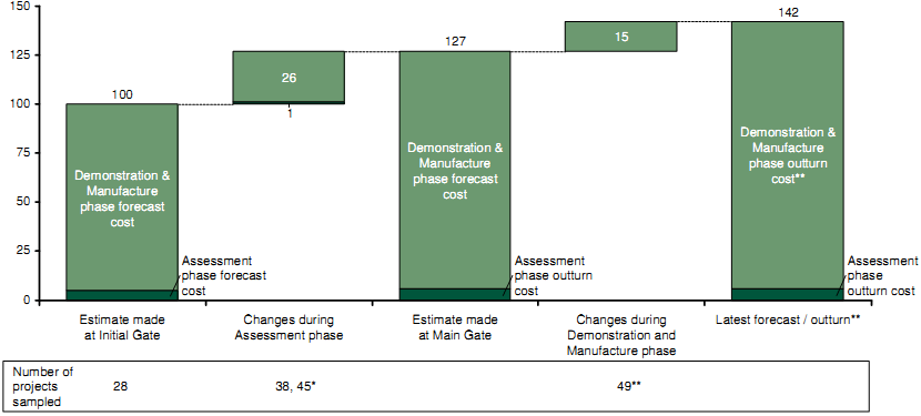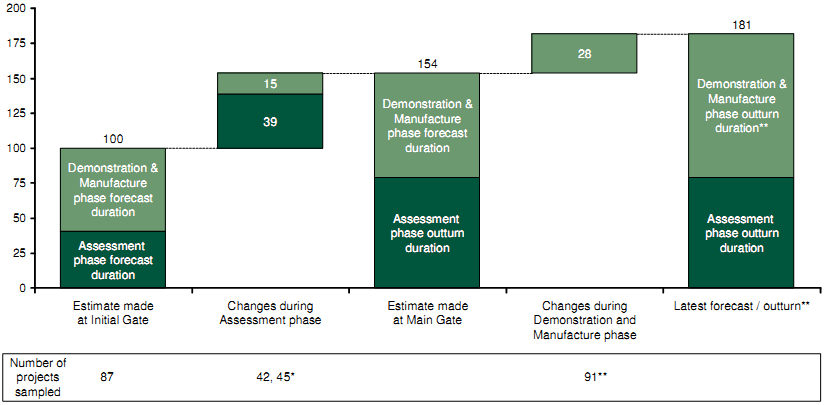 Note: * Sample of 38 in the Assessment Phase and 45 in the Demonstration & Manufacture Phase; ** Projects more than 75% complete at latest forecast