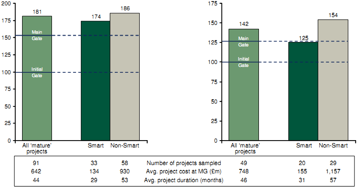 Figure 7-11 compares the average performance of mature projects which were run following the principles of Smart Procurement with those which were not.