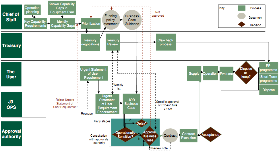This programme is distinct from the EPP in that the requirement for specific equipment has been identified in operations as key to success, and it is therefore a priority to deliver the equipment to the battlefield in as short a time as is practicable. UORs follow a somewhat different approvals process to equipment on the EPP, which is set out in Figure 7-12.