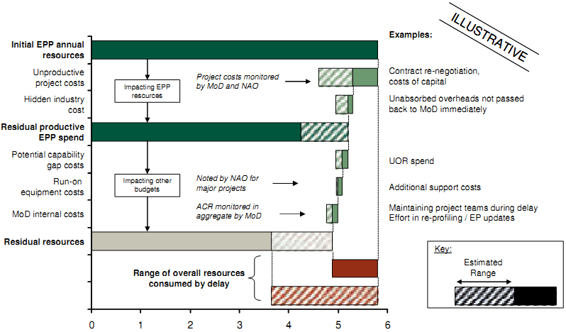 The results appear startling, particularly given that the annual expenditure on the EPP is only around £6bn. Some of the costs, however, appear in cost centres outside the EPP so are effectively hidden costs. Unproductive project costs from delay in the year may also not show up within the year, though they will need to be covered eventually to get the same level of capability. Hence the inputs of £6bn per year will not produce £6bn of productive output as planned, but a level reduced by unproductive cost increases. These impacts are illustrated in Figure 7-13 below. For intended productive input of £6bn in expenditure, the effect post-delay may be a level as low as £4bn that will prove valuable, once unproductive costs across the system are taken into account.