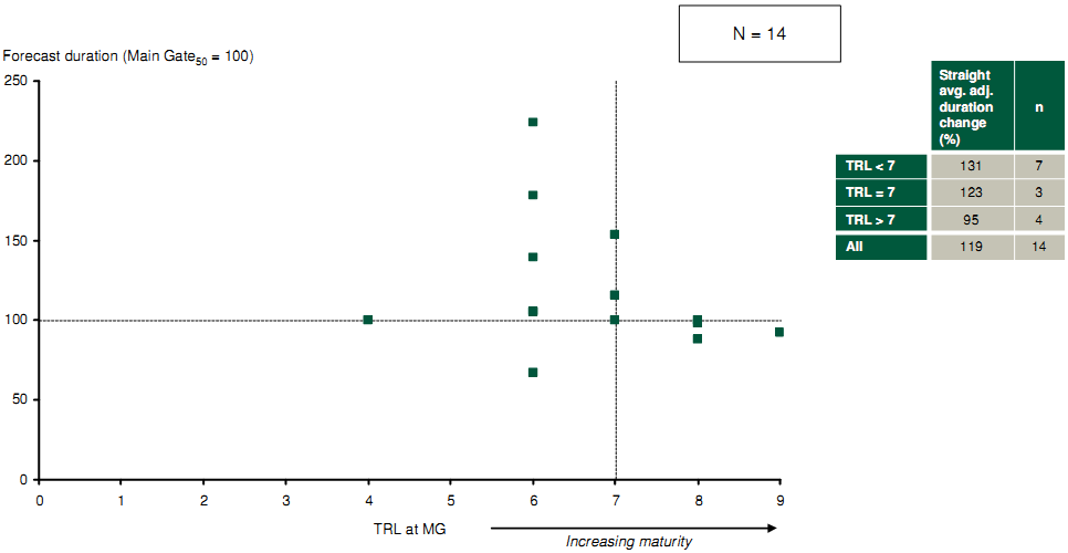 These data show that although there is a relatively weak link between TRL assessed at Main Gate and slip versus Main Gate duration estimates thereafter, projects where TRL was assessed at 8 or 9 appear to perform significantly better than those with TRLs of 7 or below.