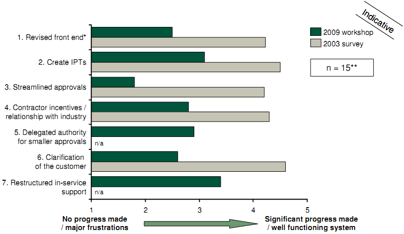 Three workshops were conducted at DE&S to discuss a range of topics relating to the effectiveness of the current acquisition system from their perspective and also to solicit ideas on how improvements might be delivered. The workshops involved c.60 members of the DE&S management team, reflecting a breadth of levels within the management tiers of DE&S (IPTs, operating centres and corporate centre), a range of functions (IPT Team leaders, Finance, Business Directors), both ex-DLO and ex-DPA staff, and both civilian and military DE&S personnel. As part of the workshop, participants were asked to rate their views on how much progress had been made on the seven principals articulated above. The results are shown in Figure 8-1. 2009 responses have been compared against a similar survey conducted in 2003 across the then DPA and DLO, along with some respondents from the ECC and industry.