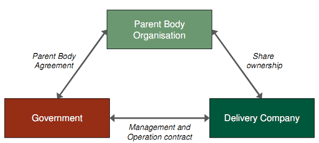 The Government contracts with the PBO through a Parent Body Agreement, which sets out the share ownership in the delivery company and the management mechanisms. In addition the Government agrees the management and operation services that are required in a Management and Operation contract between the Government and the delivery company.