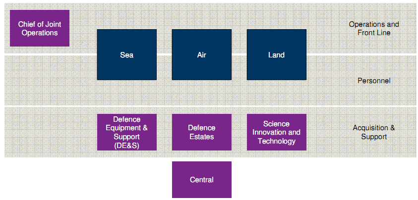 In order to deliver defence outputs effectively, the MoD is organised around eight cost centres, each of which is responsible for the delivery of specific outputs. These outputs are either elements of military capability or services which support the delivery of military capability, as indicated in schematically in Figure A-1155.