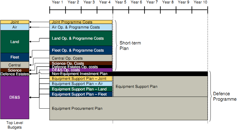 For significant investment programmes, a four year planning horizon is too short: for instance, many individual equipment procurement projects last significantly longer than that. Investment programmes are therefore planned within the 'Defence Programme', which provides a ten year budget to balance capital spend priorities across equipment acquisition, equipment support and non-equipment investments156.