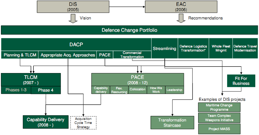 Change in defence acquisition has been implemented through an inter-related hierarchy of programmes, run by both the MoD and DE&S, as shown in Figure C-2.