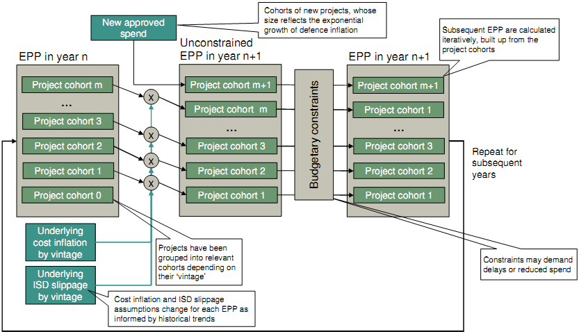An extension of the above analytical model through a possible numerical approach is outlined in Figure E-3. A model composed of individual cohorts of projects can be used to iteratively consider the EPP in each year. Each cohort of projects has a profile of expenditure and incurs particular delays and cost overruns each year. With new approved spend being added to the plan each year, this unconstrained plan is subject to budgetary constraints (analogous to the equipment review and options each planning round) to produce the final EPP for each year.