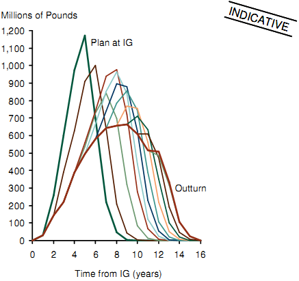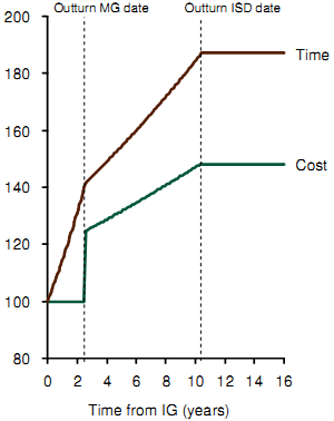 Figure E-4a shows the indicative cost and time slippage assumptions. Given these assumptions, a generalised profile of expenditure as approved at Initial Gate will evolve in each successive EPP as shown in Figure E-4b. With ISD slippages exceeding cost overruns, the profile of expenditure is stretched across a longer period than original planned with a smaller peak but a greater overall spend over the lifetime of the project to completion.