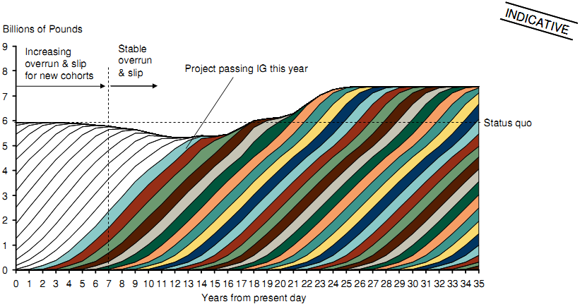 If the same amount of expenditure is approved each year and cost and time slippages are constant, the outturn unconstrained spend will reach a steady-state. Should the outturn time and cost slippages increase for a period, then, as Figure E-5 shows, the outturn unconstrained spend will transition between two steady-states. Since it is assumed that no cost overruns are observed during the Assessment phase of a cohort of projects until their Main Gate approvals, spend initially falls because expenditure has been deferred into the future. Thereafter, spend rises when increased cost overruns post-Main Gate impact projects and reaches a higher steady-state when the legacy projects are complete. In this circumstance, outturn unconstrained expenditure is higher in the long-run because although less is spent on each cohort each year (in Figure E-5 the strips become thinner), more project cohorts are active at any one time and the total spend on each cohort is higher (the area of the strips become increases). Table E-1 summarises the effect of increasing, decreasing or stable cost overruns and project delays on the EPP.