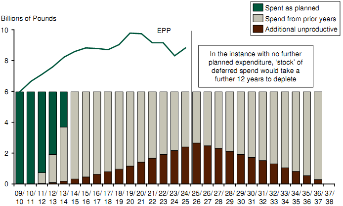 Since the EPP requires expenditure above c.£6bn in 2010/11, the additional unproductive spend arising demands the delay to some projects. This unproductive spend causes yet more expenditure to be delayed. The problem is exacerbated by the fact that the EPP consistently requires expenditure above c.£6bn. In the example above, by 2024/25 a third of annual expenditure is consumed by additional unproductive spend and it would take 12 years to deplete the 'stock' of deferred spend even if no further spend were planned.