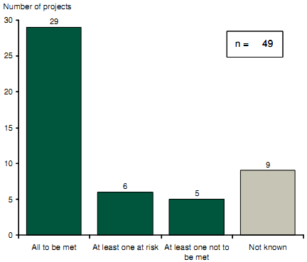 Figure F-5 shows the latest position of KURs for the 49 projects that appear in the post Main Gate cost adjusted sample. This suggests that there are five projects that have not met, or are forecast not to meet all the Key User Requirements that were specified at Main Gate. Furthermore there are six projects for which at least one Key User Requirement is defined to be at risk of not being met.