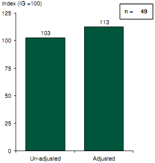 Adjusting for changes in project capability in this way has a significant impact on the rates of cost overrun, as shown in Figure F-4. In all instances, adjusted unit cost is higher than the corresponding unadjusted figures. This shows that, although projects on average overrun on cost, the overrun delivers less capability than was approved (at both Initial Gate and Main Gate)