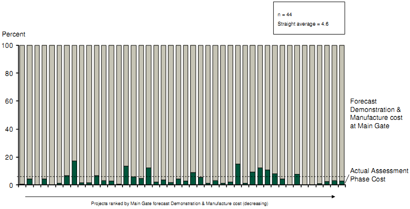 Figure F-9: Assessment phase spending as a proportion of total forecast spending through Assessment, Demonstration & Manufacture phases