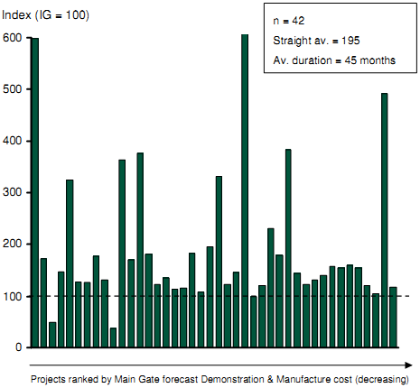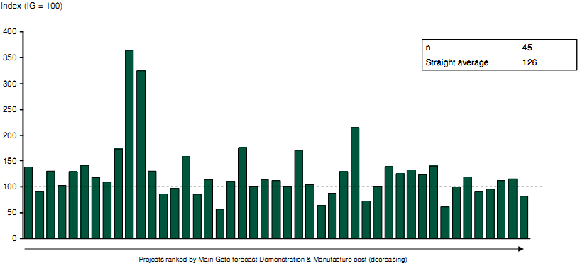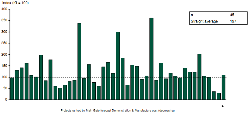 Furthermore the changes in post Main Gate forecasts over the Assessment phase have been analysed. The analysis is based upon a sample of 45 projects where the necessary cost forecasts are available and a sample of 45 projects for duration (See Section F.6 and Figure F-6).