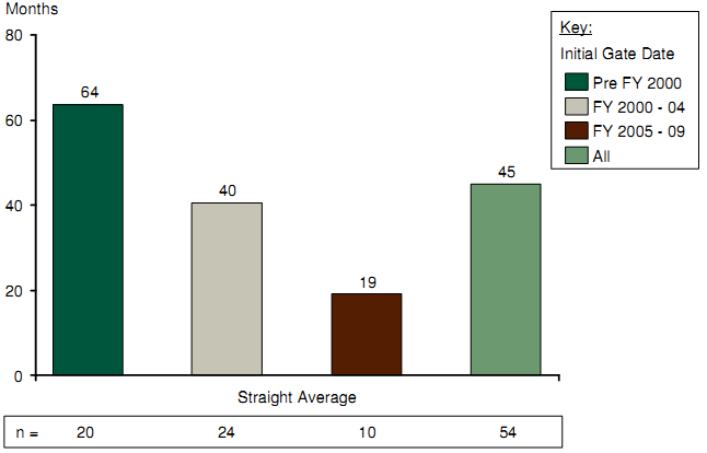 The outturn duration of Assessment phase has been analysed over time (Figure F-10). It appears that the time which projects spend in AP has been reducing over time on a straight average basis. However, since the smaller projects in the pre FY2000 sample will only appear in CMIS if spend was still occurring post April 2004, the sample is likely to be skewed towards overrunning projects. Additionally, the FY2005-09 sample will not include projects that have not yet past Main Gate (if, for example, they are overrunning). This sample may also, therefore, be subject to bias. Nonetheless, there does appear to be a trend of Assessment phase duration decreasing over time.