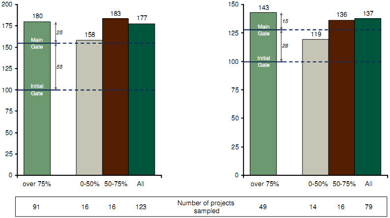 Currently both the duration and cost samples have no restrictions, with the exception of that by their nature projects must have passed through Main Gate. As a result the samples include projects that might be very young and not yet been subject to delays and cost increases. This can be illustrated by classifying projects based on project completion, which is defined as time elapsed from Main Gate to date of latest forecast as a proportion of latest forecast MG to ISD duration. The results of segmenting the samples in this way is shown in Figure F-13, which clearly illustrates that projects less than 50% complete are currently performing significantly better than the average.