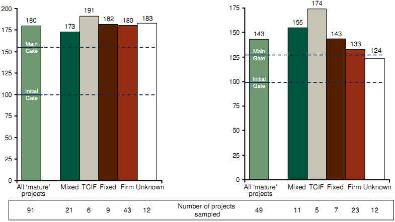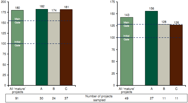 | Index of project duration (Forecast at Main Gate50 = 155) | Index of adjusted unit cost (Forecast at Main Gate50 = 128) |