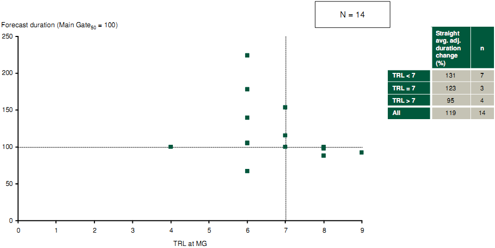 It is also of interest to examine the slippage in duration post Main Gate relative to the TRL (see Section F.13) that was included in the Main Gate project approval. This can be analysed for a sample of 14 projects (Figure F-17).