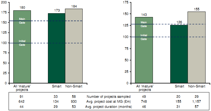 Note: Straight average shown; Projects more than 75% complete at latest forecast; * Analysis of difference by segment is based on growth during D&M phase only. Non-Smart projects include projects post 1999 deemed to have followed non-Smart principles, e.g. follow on buys of Non-Smart projects