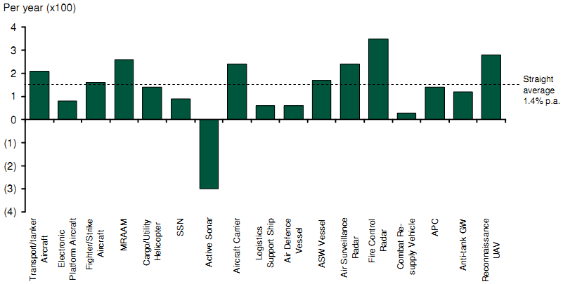 The cost context model in the HVR Family of Advanced Cost Estimating Tools ("FACET") provides estimators with the ability to compare estimated project costs with historical costs for similar programmes176. In some cases, projects in the central cost database date back as far as the 1940s. All costs are normalised to common economic conditions and corrected for differences in scale. An exponential increase of normalised, real-price unit costs is observed, with an average exponential coefficient (across 17 distinct platforms) of 1.4% p.a., as shown in Figure F-19.