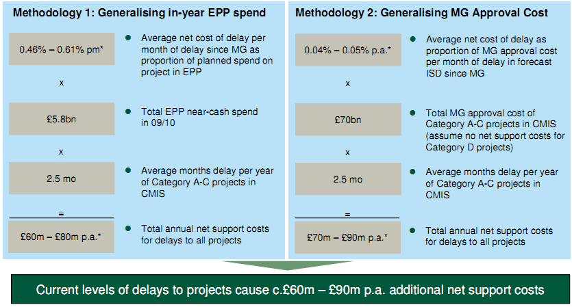 The sample of run-on equipment costs provided in the MPR can be generalised across the entire equipment plan by determining relevant metrics from these major projects and applying them across all projects. (It has been assumed that major projects are representative of category A-C projects and delays to category D projects incur no net run on costs.) Figure G-4 shows two methodologies for generalising across all projects; one by in-year Equipment Procurement Plan spend and the other by Main Gate approval cost. These different approaches consistently suggest that delays incur additional net support costs of £60m - £90m per year.