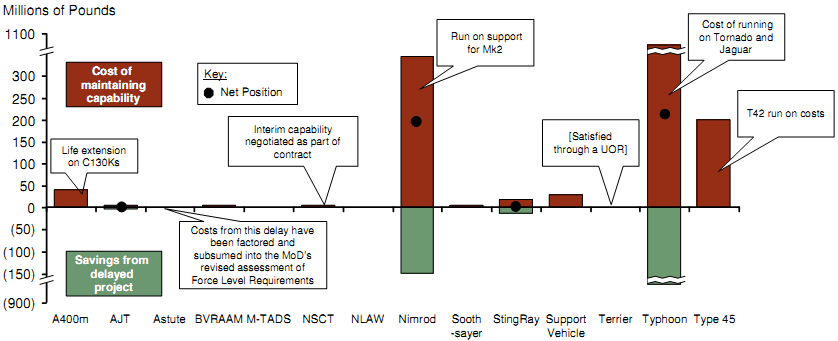 The NAO have suggested in discussions with the Review team that the run-on equipment costs given in the MPR are mostly likely conservative because likely impacts over all DLoDs have not been evaluated. Moreover, data on the Future Aircraft Carrier (CVF) project, whose ISD has been delayed since MPR 2008, suggests that there are currently active projects with run-on equipment costs (per month of delay by Main Gate approved cost) exceeding the examples given in MPR 2008. A further c.£40m p.a. of additional run-on equipment costs has been included in the estimates to account for these two factors.