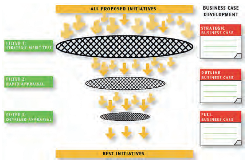 41. Amongst other sources, Infrastructure Australia's approach drew on the National Guidelines for Transport System Management (National Guidelines) which were endorsed by the Australian Transport Council in November 2004, and updated in December 2006. As outlined in ANAO Audit Report No. 29 2008-09, Delivery of Projects on the AusLink National Network, the National Guidelines advocate that all proposed projects should be subject to the same appraisal process and that appraised proposals should be prioritised to develop a forward program of preferred initiatives through a transparent process that is founded on sound economic and business investment principles.23 The framework set out in the National Guidelines uses a three‐ stage appraisal process, illustrated in Figure S 2. The intention is that the projects that pass through all filters, demonstrate strategic merit and fit, and perform well in a detailed appraisal, which is to be a: