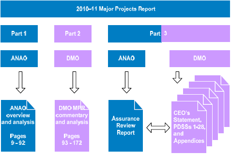 • Part 1 comprises the ANAO's overview, incorporating a Summary, Chapter 1 2010-11 MPR Review, Chapter 2 Projects' Performance, and Chapter 3 Governance and Business Processes;