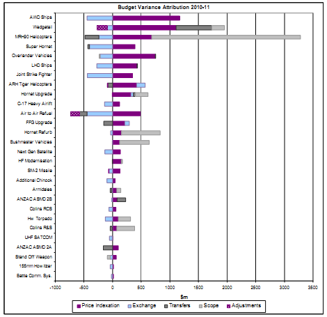• Adjustments: No Budgetary adjustments occurred against projects in this year's report. However previous years saw Air to Air Refuelling and Wedgetail budget adjustment reductions of over $150m each primarily due to changes in the currency mix and indexation parameters to those applied at original budget approval.