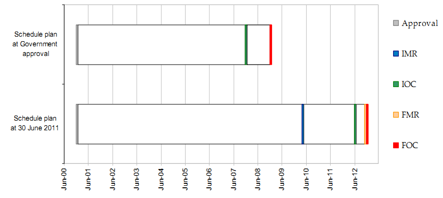 Initial Materiel Release (IMR) | N/A | Apr 10 | N/A | Delays to system delivery due to problems associated with sub-system integration, supplier hardware availability, radar and electronic support measures maturity, and aircraft modification. |