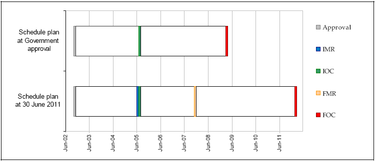 Mar 09 | Feb 12 | 36 | Delay in achieving FOC due to outstanding latent defects that must be rectified to satisfy Navy OR requirements. OR of the first vessel was achieved on 19 May 2010. A rectification program has been instigated and is on schedule to bring all vessels to the product baseline by December 2011. This will enable the achievement of FOC for the class February 2012. HMA Ships GLENELG, MARYBOROUGH, CHILDERS, ARMIDALE, LAUNCESTON, LARRAKIA, BATHURST and ALBANY have completed their rectification work as scheduled. | |