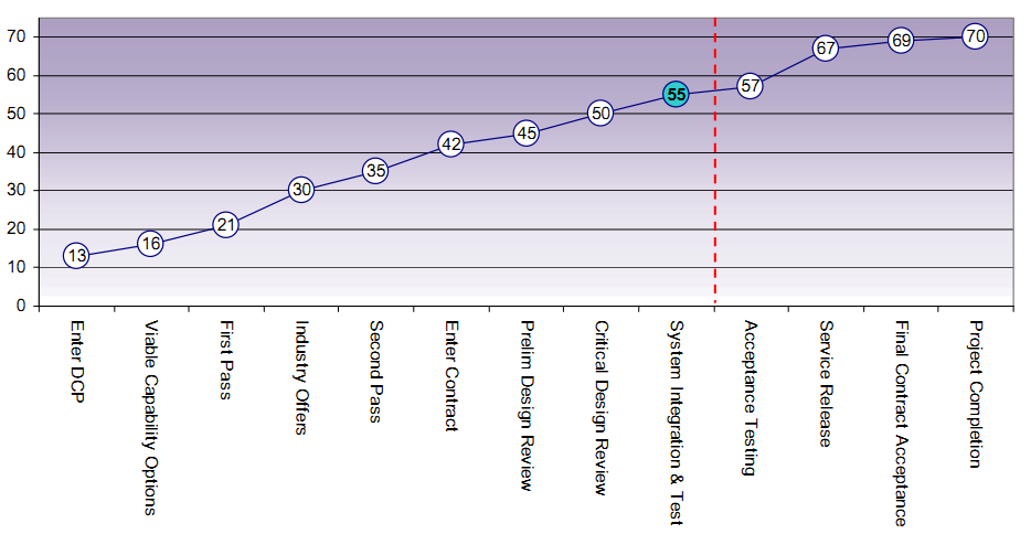 Explanation | • Cost: IS-22 is essentially an off the shelf product on a firm fixed price contract which means the project is ahead of the benchmark. • Requirement: The essentially off the shelf nature of the IS-22 hosted payload means it is ahead of the bench mark for testing against the requirements. • Technical Understanding and Operations and Support: The project is lagging slightly in Technical Understanding and Operational support primarily due to Defence still developing the Concept of Operations for the capability. | ||||||||