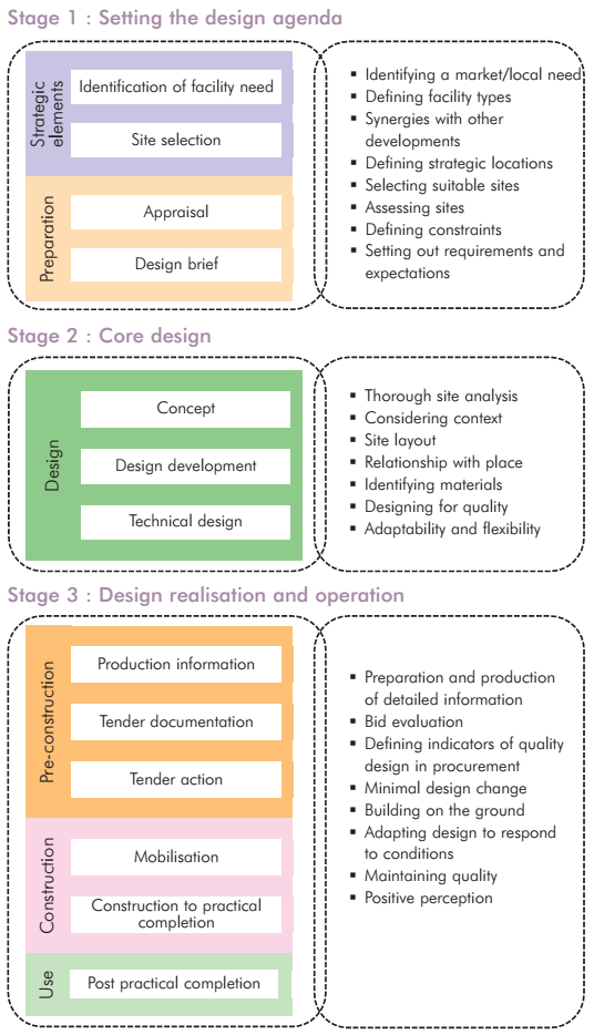 The design process is not a fixed, prescriptive set of rules, but should flow with the natural development of a project, from the identification of a need through to the delivery of the final development. The basic design process is applicable to all scales of development but the importance and level of detail will vary with scale. It should not be viewed as a simple linear process, but as an iterative one with various stages that inform the final solution.