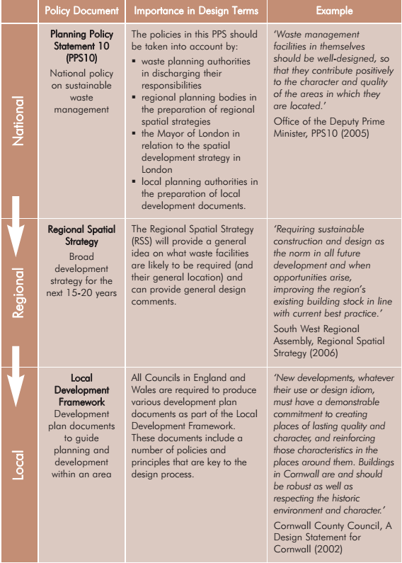 The development plan system provides the essential framework for guiding and controlling new waste facility development. It also helps local authorities achieve better standards of design for new waste buildings. The development plan documents allow scope for providing input at various levels so that design considerations are an integral part of the plan preparation and decision making process. The core strategy and site policies should set the agenda while the role of a supplementary planning document on design could be to describe the detailed route plan. When these documents start to make specific recommendations, for example on the allocation of sites, it is important that design considerations feed into this process.