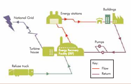 | What is it? • Large scale combined heat and power (CHP) network, forming one of the largest waste fuelled district heating and power generation systems in the UK. Design Features • Combined electricity (19MW) and Thermal (Hot Water) (60MW) energy plant. • The district energy network successfully connects over 140 public and commercial buildings via a 44km pipeline. • Demonstrates effective multi agency and (non waste and waste) stakeholder co-operation for wider community benefit. |