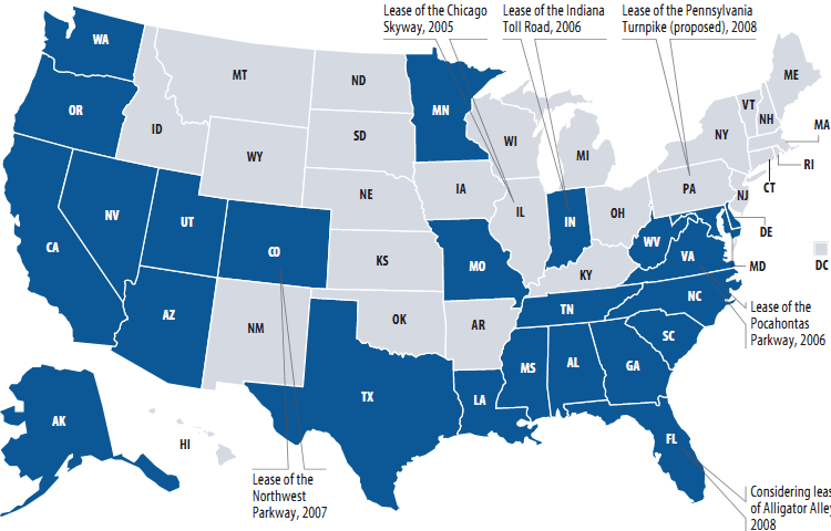 24 states (shaded) have enacted some sort of legislation to allow public-private partnerships for transportation.