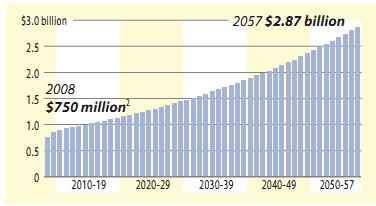 1. 5 percent and 12 percent annual returns assuming the state would have invested an estimated $10.2 billion principal from the upfront payment on a lease of the Pennsylvania Turnpike and would not spend the principal over the term. The state used a 12 percent assumption because the State Employees' Retirement System had achieved 12 percent annualized returns over the previous 20 years. Morgan Stanley, the state's advisor, also modeled 5 percent annual returns as a point of comparison. The chart runs through 2057, the lifespan of Act 44. | |